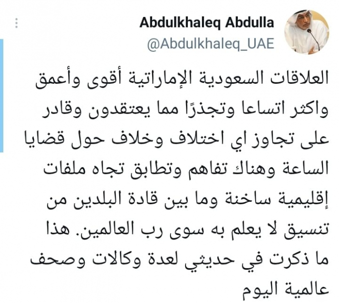 وقال في تغريدة على حسابه بموقع التدوين المصغر تويتر، اليوم إن: "العلاقات السعودية الإماراتية أقوى وأعمق وأكثر اتساعا وتجذرًا مما يعتقدون وقادرة على تجاوز أي اختلاف وخلاف حول قضايا الساعة".