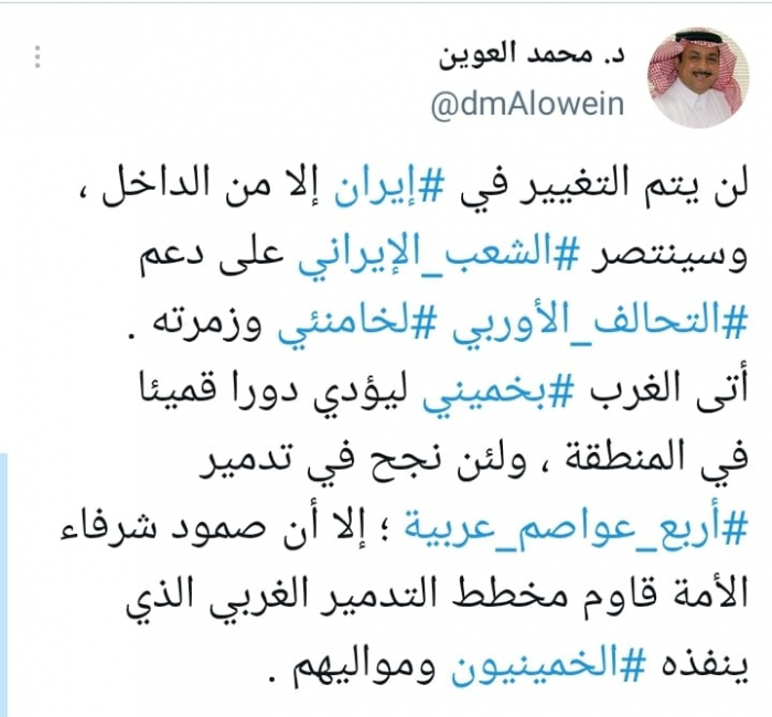 أكد الأكاديمي السعودي الدكتور محمد العوين، أن الشعب الإيراني سينتصر على الدعم الغربي لمرشد ملالي طهران وعصابته.