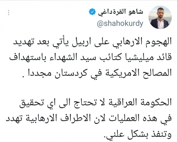 وشدد في تغريدة على حسابه بموقع التدوين المصغر تويتر، اليوم على أن: "الهجوم الإرهابي على أربيل يأتي بعد تهديد قائد ميليشيا كتائب سيد الشهداء باستهداف المصالح الأمريكية في كردستان مجددا".