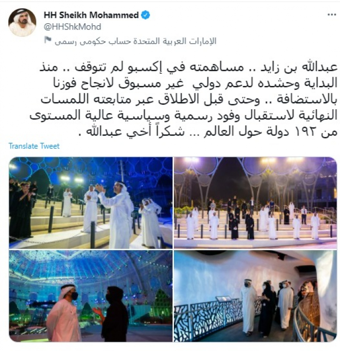 وقال في تغريدة عبر "تويتر" رصدها "المشهد العربي": "عبدالله بن زايد .. مساهمته في إكسبو لم تتوقف".