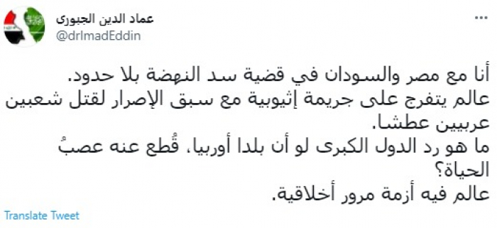 أعلن المحلل السياسي العراقي عماد الدين الجبوري، اليوم الأربعاء، مساندته لمصر والسودان في أزمة سد النهضة الإثيوبي.
