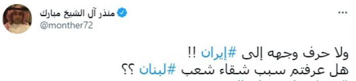 وقال في تغريدة عبر "تويتر" رصدها "المشهد العربي": "ولا حرف وجهه إلى إيران.. هل عرفتم سبب شقاء شعب لبنان".