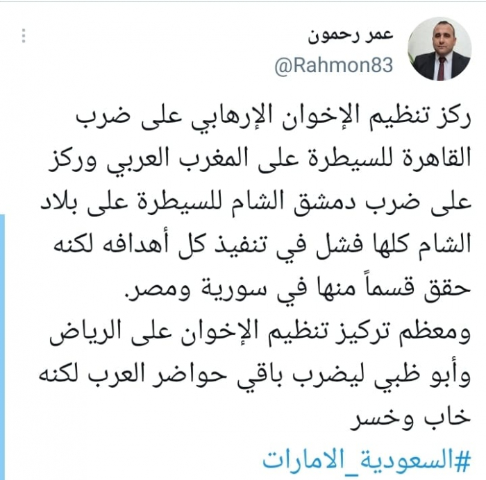 وأضاف أن: "معظم تركيز تنظيم الإخوان على الرياض وأبو ظبي ليضرب باقي حواضر العرب لكنه خاب وخسر"، مختتما بهاشتاج: "السعودية الإمارات".