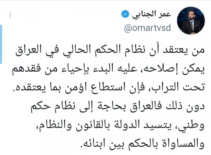 اعتبر الكاتب الصحفي عمر الجنابي، أن نظام الحكم في العراق غير قابل للإصلاح، مطالبا بنظام وطني يعتمد على سيادة القانون والمساواة.