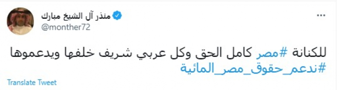 وقال في تغريدة عبر "تويتر" رصدها "المشهد العربي": "للكنانة مصر كامل الحق وكل عربي شريف خلفها ويدعموها".