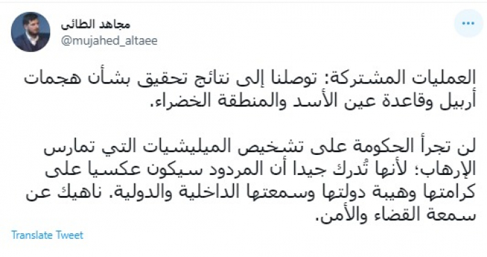 وكتب في تغريدة عبر "تويتر" رصدها "المشهد العربي": "العمليات المشتركة: توصلنا إلى نتائج تحقيق بشأن هجمات أربيل وقاعدة عين الأسد والمنطقة الخضراء".