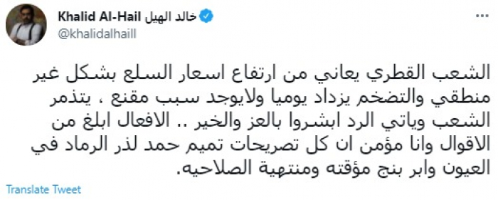وكتب في تغريدة عبر "تويتر" رصدها "المشهد العربي": "الشعب القطري يعاني من ارتفاع أسعار السلع بشكل غير منطقي والتضخم يزداد يوميًا ولا يوجد سبب مقنع ، يتذمر الشعب وياتي الرد ابشروا بالعز والخير".