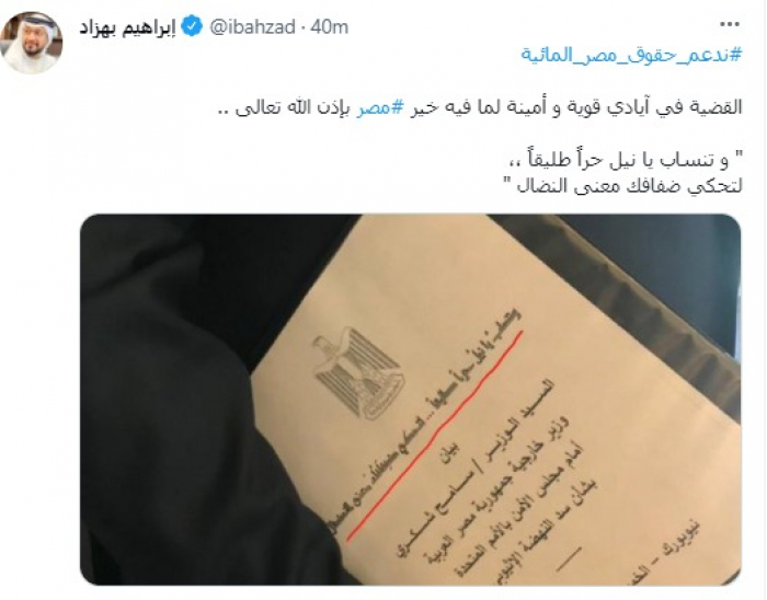 أعلن المدون الإماراتي البارز إبراهيم بهزاد، اليوم الجمعة، دعم حقوق مصر المائية في أزمة سد النهضة.