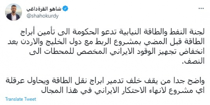 وكتب في تغريدة عبر "تويتر" رصدها "المشهد العربي": "لجنة النفط والطاقة النيابية تدعو الحكومة الى تأمين أبراج الطاقة قبل المضي بمشروع الربط مع دول الخليج والأردن بعد انخفاض تجهيز الوقود الإيراني المخصص للمحطات الى النصف".