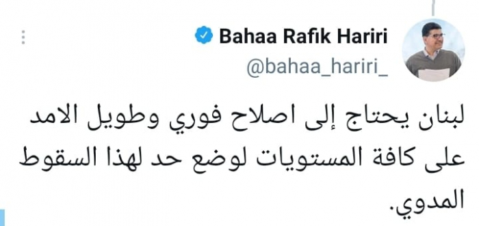 طالب رجل الأعمال اللبناني بهاء الحريري، نجل رئيس الوزراء الأسبق رفيق الحريري بإصلاح فوري للوضع في لبنان لمنع الانهيار.