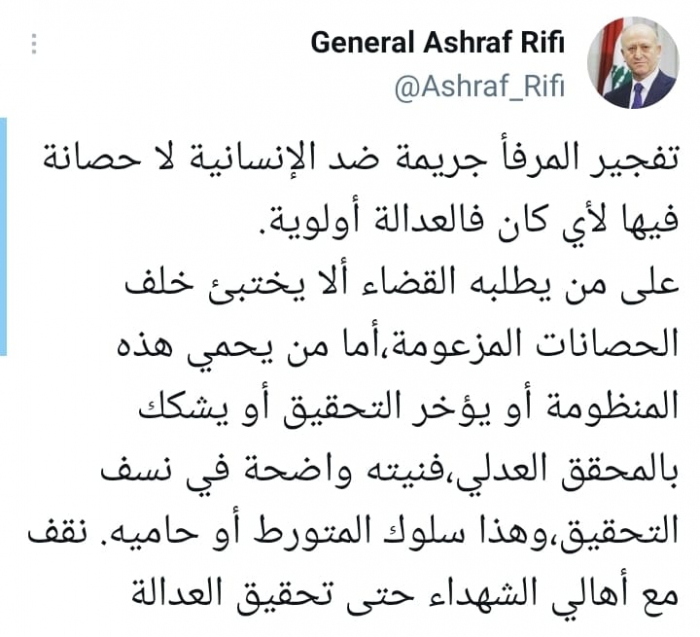 وشدد في تغريدة على حسابه بموقع التدوين المصغر تويتر، اليوم على أن: "تفجير المرفأ جريمة ضد الإنسانية لا حصانة فيها لأي كان فالعدالة أولوية".