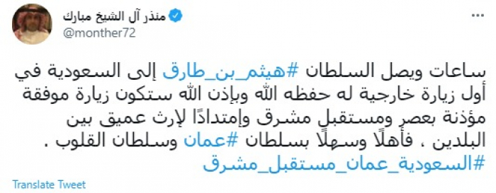 وقال في تغريدة عبر "تويتر" رصدها "المشهد العربي": "ساعات ويصل السلطان هيثم بن طارق إلى السعودية في أول زيارة خارجية له حفظه الله وبإذن الله ستكون زيارة موفقة مؤذنة بعصر ومستقبل مشرق وإمتدادًا لإرث عميق بين البلدين، فأهلًا وسهلًا بسلطان عمان وسلطان القلوب".
