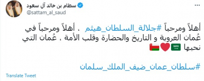 رحب الأمير السعودي البارز سطام بن خالد آل سعود، اليوم الأحد، بزيارة سلطان عُمان السلطان هيثم بن طارق إلى السعودية.