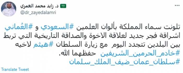 وكتب في تغريدة عبر "تويتر" رصدها "المشهد العربي": "تلونت سماء المملكة بألوان العلمين السعودي والعُماني اشراقة فجر جديد لعلاقة الاخوة والصداقة التاريخية التي تربط بين البلدين تتجدد اليوم مع زيارة السلطان هيثم لأخيه خادم الحرمين الشريفين حفظهما الله".