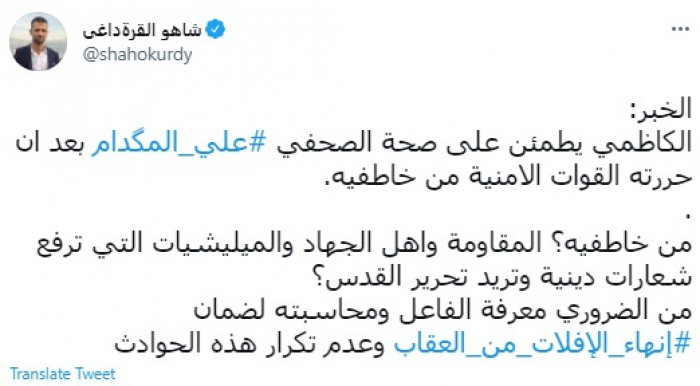وقال في تغريدة عبر "تويتر" رصدها "المشهد العربي": "الخبر: الكاظمي يطمئن على صحة الصحفي علي المگدام بعد أن حررته القوات الأمنية من خاطفيه".
