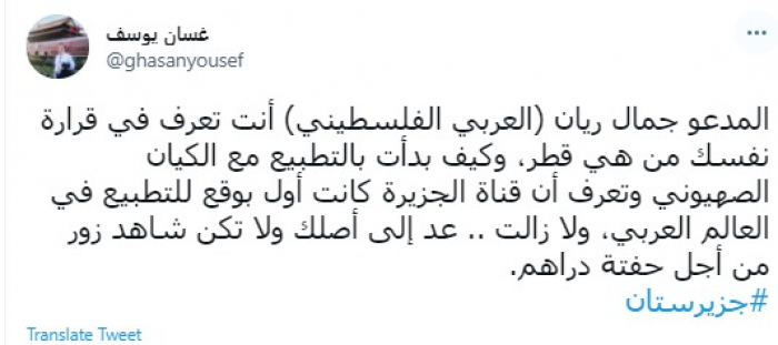 وقال في تغريدة عبر "تويتر" رصدها "المشهد العربي": "المدعو جمال ريان (العربي الفلسطيني) أنت تعرف في قرارة نفسك من هي قطر، وكيف بدأت بالتطبيع مع الكيان الصهيوني وتعرف أن قناة الجزيرة كانت أول بوقع للتطبيع في العالم العربي، ولا زالت".