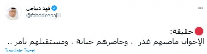 وقال في تغريدة عبر "تويتر" رصدها "المشهد العربي": "حقيقة.. الإخوان ماضيهم غدر ، وحاضرهم خيانة، ومستقبلهم تآمر".