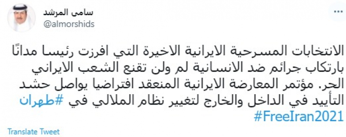وقال في تغريدة عبر "تويتر" رصدها "المشهد العربي": "الانتخابات المسرحية الإيرانية الأخيرة التي أفرزت رئيسا مدانًا بارتكاب جرائم ضد الانسانية لم ولن تقنع الشعب الإيراني الحر".