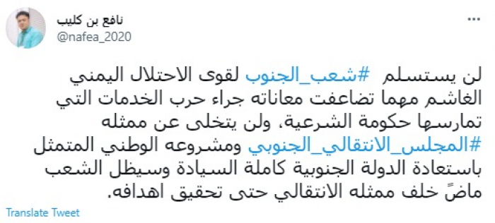 وأضاف: "ولن يتخلى عن ممثله المجلس الانتقالي الجنوبي ومشروعه الوطني المتمثل باستعادة الدولة الجنوبية كاملة السيادة وسيظل الشعب ماضً خلف ممثله الانتقالي حتى تحقيق أهدافه".