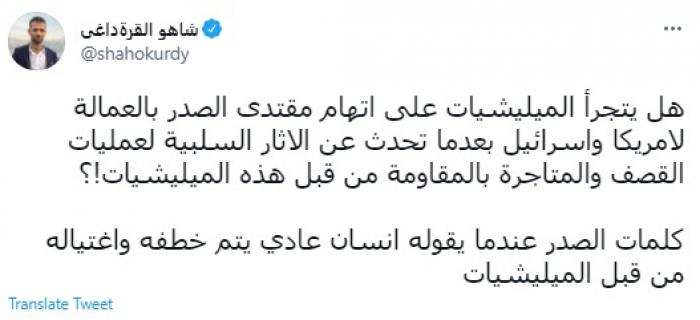 وأضاف: "كلمات الصدر عندما يقوله إنسان عادي يتم خطفه واغتياله من قبل المليشيات".