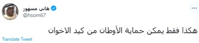 وقال في تغريدة عبر "تويتر" رصدها "المشهد العربي": "هكذا فقط يمكن حماية الأوطان من كيد الإخوان".