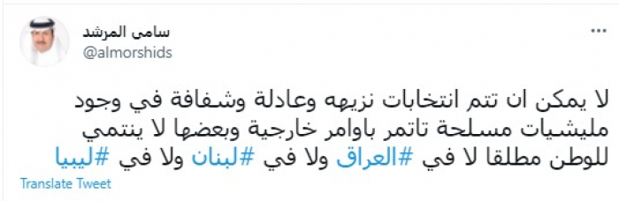 وقال في تغريدة عبر "تويتر" رصدها "المشهد العربي": "لا يمكن أن تتم انتخابات نزيهه وعادلة وشفافة في وجود مليشيات مسلحة تاتمر بأوامر خارجية وبعضها لا ينتمي للوطن مطلقا لا في العراق ولا في لبنان ولا في ليبيا".