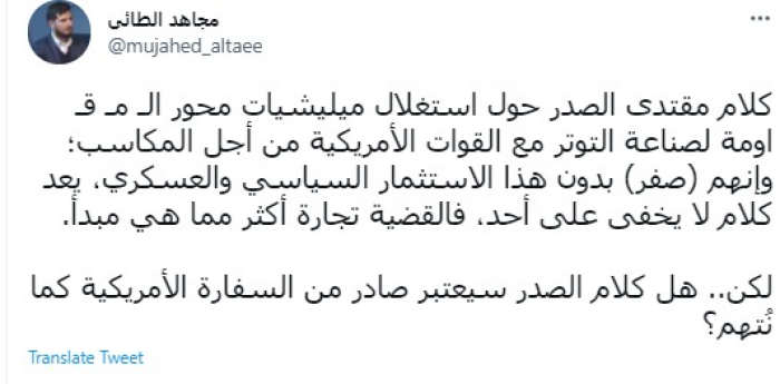 وقال في تغريدة عبر "تويتر" رصدها "المشهد العربي": "كلام مقتدى الصدر حول استغلال ميليشيات محور المقاومة لصناعة التوتر مع القوات الأمريكية من أجل المكاسب؛ وإنهم (صفر) بدون هذا الاستثمار السياسي والعسكري، يعد كلام لا يخفى على أحد، فالقضية تجارة أكثر مما هي مبدأ".