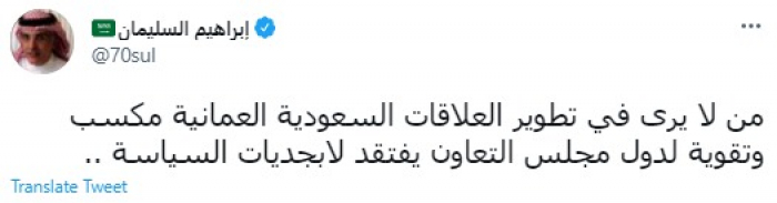 وكتب في تغريدة عبر "تويتر" رصدها "المشهد العربي": "من لا يرى في تطوير العلاقات السعودية العمانية مكسب وتقوية لدول مجلس التعاون يفتقد لأبجديات السياسة".