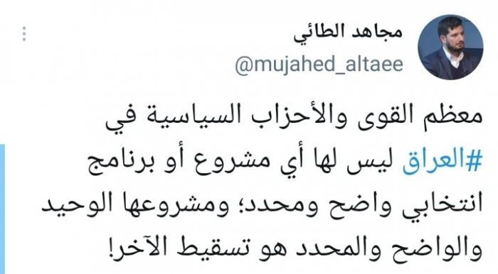 وقال في تغريدة على حسابه بموقع التدوين المصغر تويتر، اليوم إن: "معظم القوى والأحزاب السياسية في العراق ليس لها أي مشروع أو برنامج انتخابي واضح ومحدد".