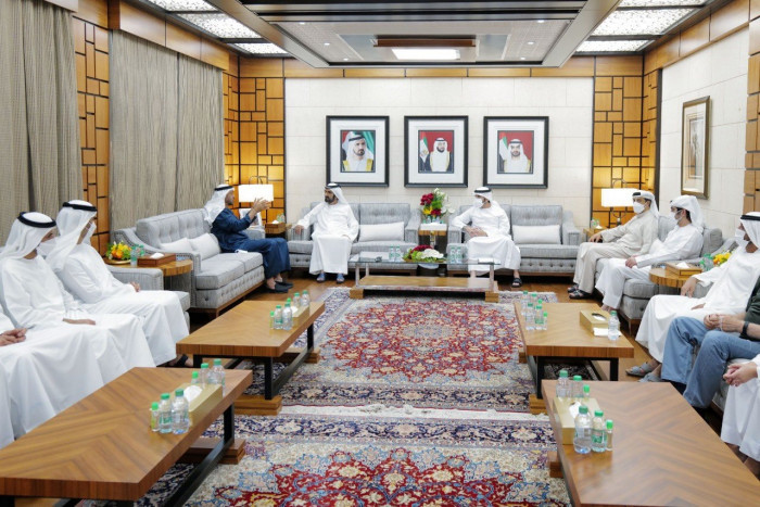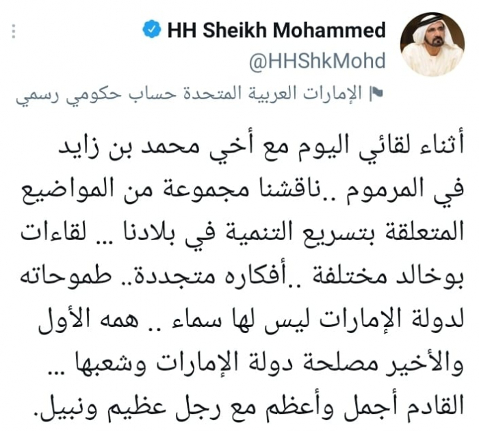 وأوضح في تغريدة على حسابه بموقع التدوين المصغر تويتر، اليوم أنه: "أثناء لقائي اليوم مع أخي محمد بن زايد في المرموم، ناقشنا مجموعة من المواضيع المتعلقة بتسريع التنمية في بلادنا".