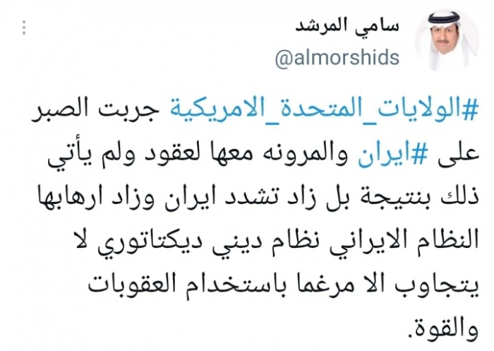 وشدد في تغريدة على حسابه بموقع التدوين المصغر تويتر، اليوم على أن: "الولايات المتحدة الأمريكية جربت الصبر على إيران والمرونة معها لعقود".