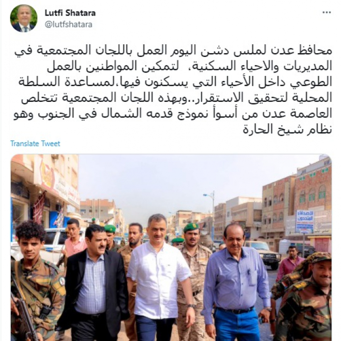 وقال في تغريدة عبر "تويتر" رصدها "المشهد العربي": "محافظ عدن لملس دشن اليوم العمل باللجان المجتمعية في المديريات والأحياء السكنية، لتمكين المواطنين بالعمل الطوعي داخل الأحياء التي يسكنون فيها، لمساعدة السلطة المحلية لتحقيق الاستقرار".