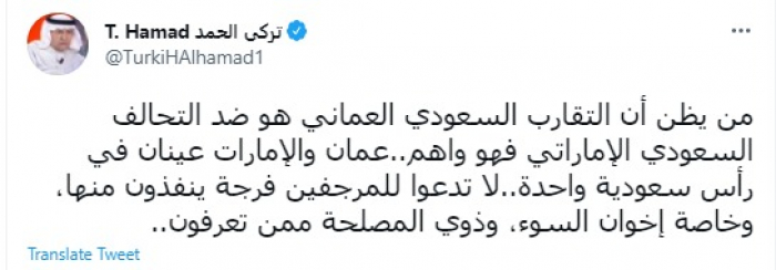 وقال في تغريدة عبر "تويتر" رصدها "المشهد العربي": "من يظن أن التقارب السعودي العماني هو ضد التحالف السعودي الإماراتي فهو واهم.. عمان والإمارات عينان في رأس سعودية واحدة".