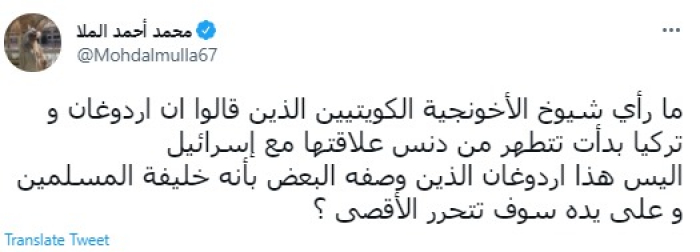 وقال في تغريدة عبر "تويتر" رصدها "المشهد العربي": "ما رأي شيوخ الإخونجية الكويتيين الذين قالوا إن أردوغان و تركيا بدأت تتطهر من دنس علاقتها مع إسرائيل".