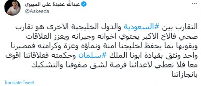 وقال في تغريدة عبر "تويتر" رصدها "المشهد العربي": "التقارب بين السعودية والدول الخليجية الاخرى هو تقارب صحي فالأخ الأكبر يحتوي إخوانه وجيرانه ويعزز العلاقات ويقويها بما يحفظ لخليجنا أمنة ونماؤه وعزة وكرامته".