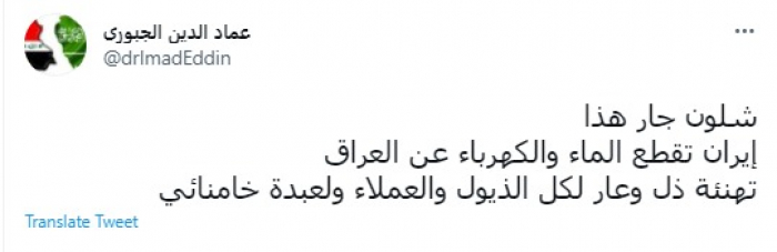 وقال في تغريدة عبر "تويتر" رصدها "المشهد العربي": "شلون جار هذا إيران تقطع الماء والكهرباء عن العراق تهنئة ذل وعار لكل الذيول والعملاء ولعبدة خامنئي".