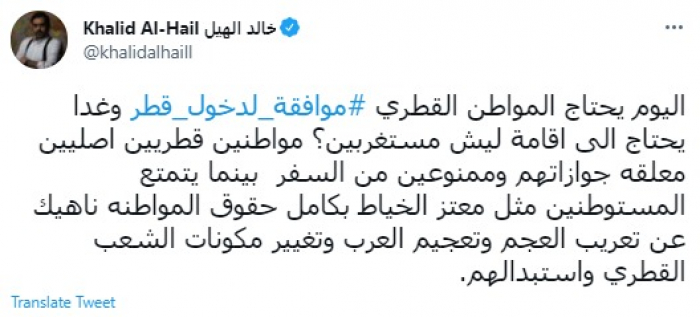 وقال في تغريدة عبر "تويتر" رصدها "المشهد العربي": "اليوم يحتاج المواطن القطري موافقة لدخول قطر وغدا يحتاج إلى إقامة ليش مستغربين؟".