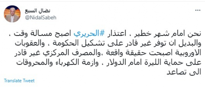 توقع المحلل السياسي اللبناني نضال السبع، اليوم الثلاثاء، اعتذار رئيس الوزراء اللبناني المكلف سعد الحريري عن استكمال مهمته، مؤكدًا أن لبنان يمر بمرحلة حرجة.