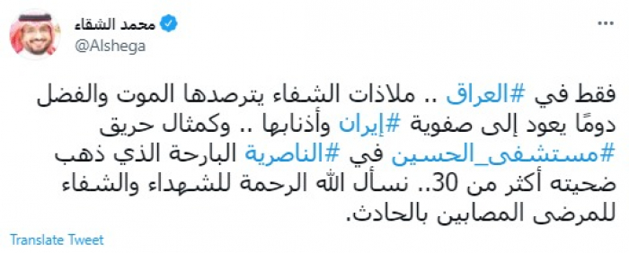 حمل الكاتب السعودي محمد الشقاء، اليوم الثلاثاء، إيران مسؤولية الحريق الذي اندلع في مستشفى الحسين بالناصرية في العراق.
