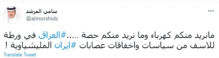 وكتب في تغريدة عبر "تويتر" رصدها "المشهد العربي": "ما نريد منكم كهرباء وما نريد منكم حصة.. العراق في ورطة للأسف من سياسات وإخفاقات عصابات إيران المليشياوية".