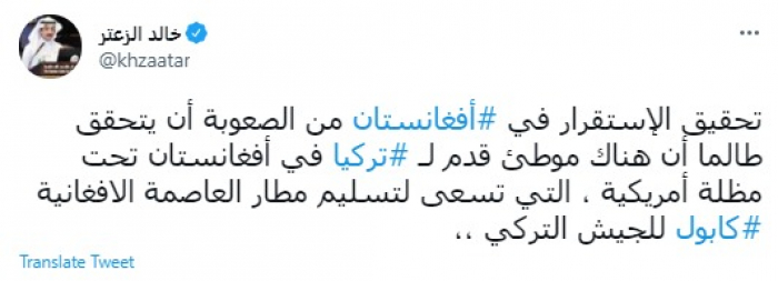وقال في تغريدة عبر "تويتر" رصدها "المشهد العربي": "تحقيق الاستقرار في أفغانستان من الصعوبة أن يتحقق طالما أن هناك موطئ قدم لتركيا في أفغانستان تحت مظلة أمريكية، التي تسعى لتسليم مطار العاصمة الأفغانية كابول للجيش التركي".