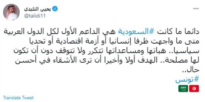 أشاد المحلل السياسي السعودي يحيى التليدي، اليوم الثلاثاء، بمساندة السعودية لتونس خلال الأزمة الصحية التي تمر بها البلاد مؤخرًا.