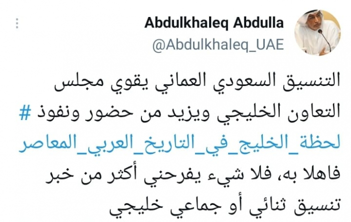 أشاد الأكاديمي الإماراتي الدكتور عبدالخالق عبدالله، بالتسنيق السعودي العماني، موضحا أنه يساهم في تقوية مجلس التعاون لدول الخليج العربية.