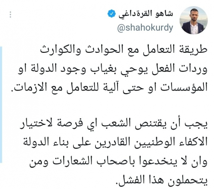 اعتبر الكاتب الصحفي شاهو قرة داغي، أن آليات تعامل السلطات العراقية مع الحوادث يكشف عن غياب الدولة ومؤسساتها.