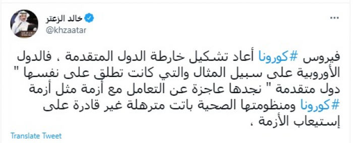 وكتب في تغريدة عبر "تويتر" رصدها "المشهد العربي": "فيروس كورونا أعاد تشكيل خارطة الدول المتقدمة، فالدول الأوروبية على سبيل المثال والتي كانت تطلق على نفسها دول متقدمة نجدها عاجزة عن التعامل مع أزمة مثل أزمة كورونا".