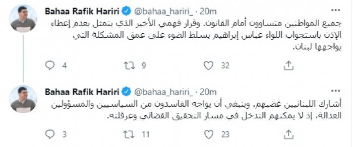 وقال في تغريدات عبر "تويتر" رصدها "المشهد العربي": "جميع المواطنين متساوون أمام القانون. وقرار فهمي الأخير الذي يتمثل بعدم إعطاء الإذن باستجواب اللواء عباس إبراهيم يسلط الضوء على عمق المشكلة التي يواجهها لبنان".