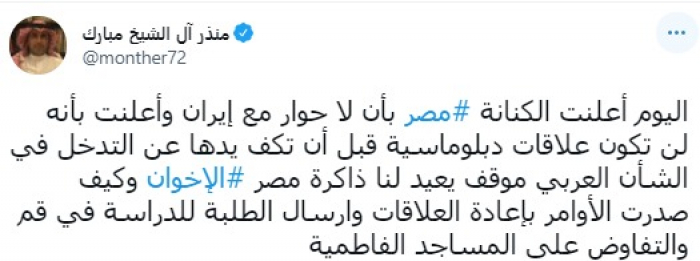 وقال في تغريدة عبر "تويتر" رصدها "المشهد العربي": "اليوم أعلنت الكنانة مصر بأن لا حوار مع إيران وأعلنت بأنه لن تكون علاقات دبلوماسية قبل أن تكف يدها عن التدخل في الشأن العربي".