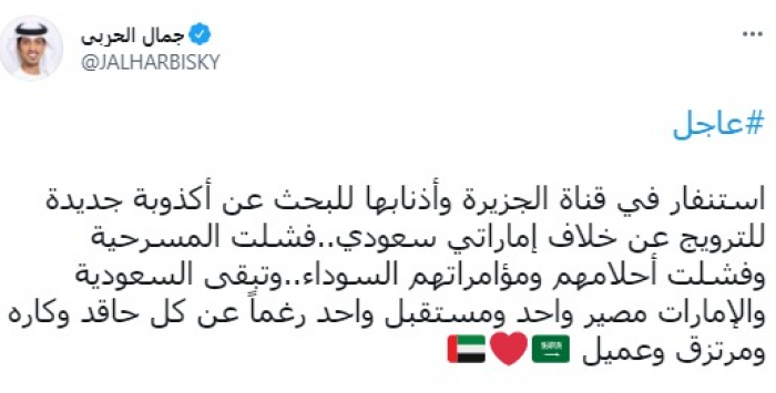 الحربي: السعودية والإمارات مستقبلهم واحد ومسرحية الجزيرة فشلت