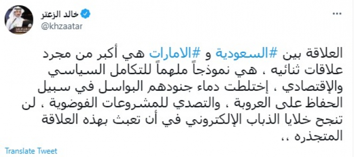 اعتبر المحلل السياسي السعودي خالد الزعتر، اليوم الأربعاء، أن العلاقة بين السعودية والإمارات بمثابة النموذج الملهم للتكامل السياسي والاقتصادي.