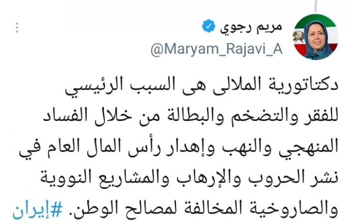 وأوضحت في تغريدة على حسابها بموقع التدوين المصغر تويتر، اليوم أن: "دکتاتوریة الملالی هی السبب الرئيسي للفقر والتضخم والبطالة".